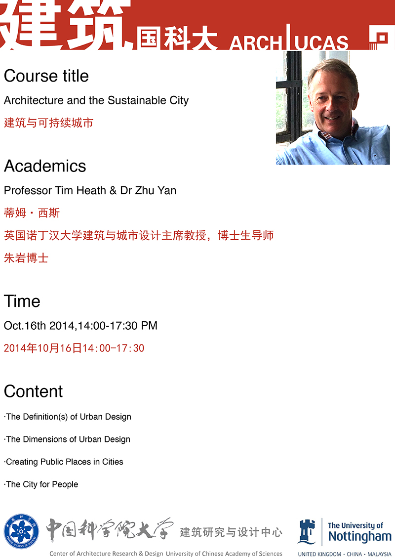 2014年10月16日,英国诺丁汉大学建筑与城市设计主席教授,博士生导师Tim Heath开设的系列讲座《建筑与可持续城市(Architecture and the Sustainable City)》的第一讲在建筑中心展开。